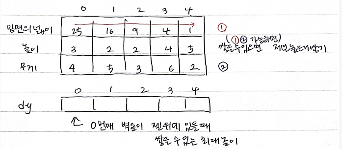 결국 dy[2]는 벽돌(25,3,4)의 3 + 자기자신(9,2,3)의 2를 더해 5값이 들어가는 것이다.