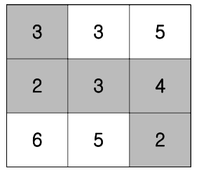 해당 돌다리를 건널때 돌의 높이 만큼 에너지가 소비됩니다. 이동은 최단거리 이동을 합니다. 즉 현재 지점에서 오른쪽 또는 아래쪽으로만 이동해야 합니다. N*N의 계곡의 돌다리 격자정보가 주어지면 (1, 1)격자에서 (N, N)까지 가는데 드는 에너지의 최소량을 구하는 프로그램을 작성하세요. 만약 N=3이고, 계곡의 돌다리 격자 정보가 다음과 같다면