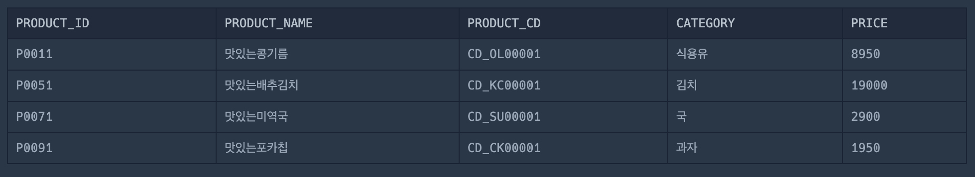 | PRODUCT_ID | PRODUCT_NAME | PRODUCT_CD | CATEGORY | PRICE |