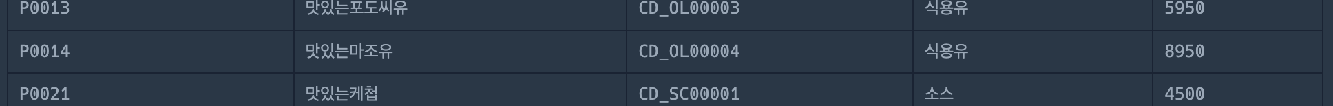 | P0021 | 맛있는케첩 | CD_SC00001 | 소스 | 4500 |