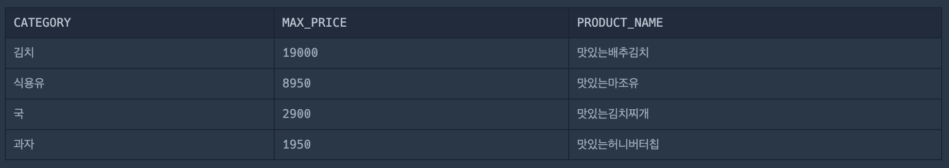 앞의 ID와 식품 이름과 식품 코드는 다른 식품의 데이터이고 PRICE만 같은 카테고리 내에서 MAX값을 가진 것으로 조회된 것 !