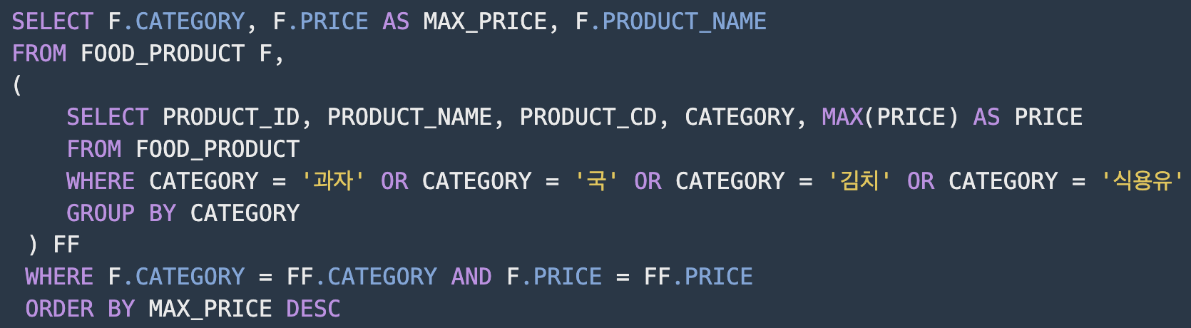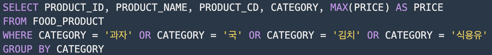 - 카테고리 별로 가장 큰 가격을 가진 식품은 하나이기에 카테고리 별로 가장 높은 가격인 상품을 뽑고, 거기에서 가격과 카테고리가 같은 상품의 데이터를 다시 조회한다.