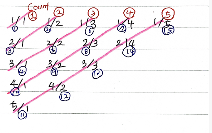 무한히 큰 배열에 다음과 같이 분수들이 적혀있다.