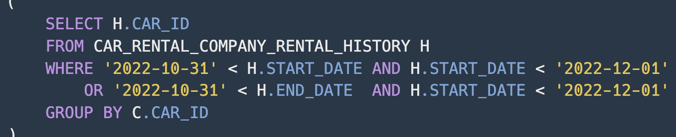 일단 서브쿼리는 2022년 11월 1일부터 2022년 11월 30일까지 대여 가능하지 않은 CAR_ID만 조회한 테이블 입니다.