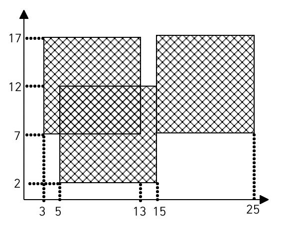 예를 들어 흰색 도화지 위에 세 장의 검은색 색종이를 그림과 같은 모양으로 붙였다면 검은색 영역의 넓이는 260이 된다.