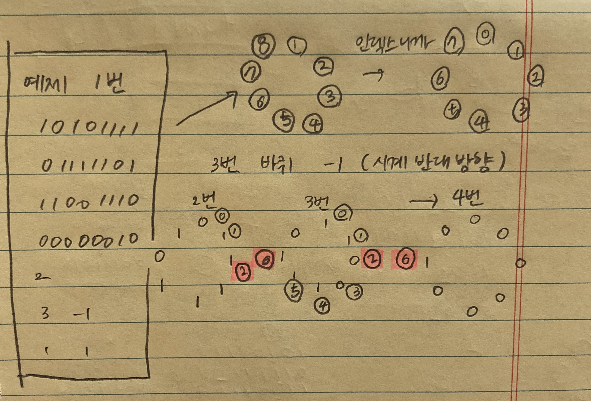 다 끝났으면 12시 방향에 있는 바퀴 인덱스 번호(0)에 있는 값에 따라 각각 1, 2, 4, 8을 곱한 값을 다 더하여 출력합니다.