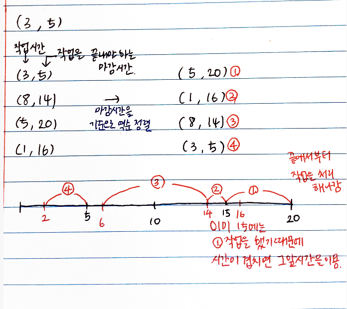 마감시간을 역순으로 정렬하여 뒤에서 부터 작업을 해나가면 됩니다.