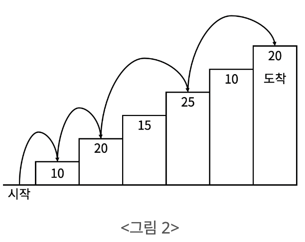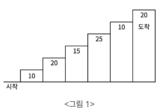 예를 들어 <그림 2>와 같이 시작점에서부터 첫 번째, 두 번째, 네 번째, 여섯 번째 계단을 밟아 도착점에 도달하면 총 점수는 10 + 20 + 25 + 20 = 75점이 된다.