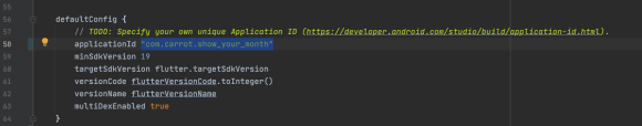 defaultConfig 및 applicationId에 package 이름을