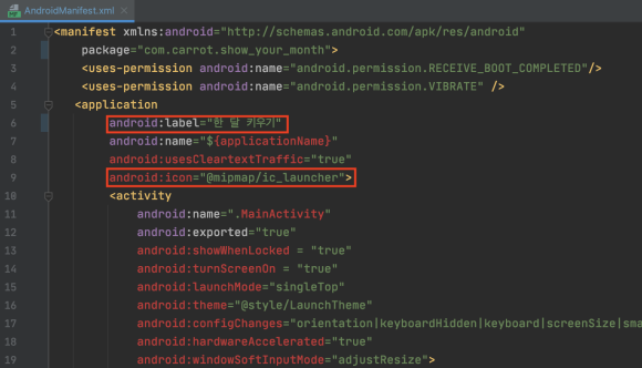 1번에서 바꿨던 이미지의 이름이 android:icon="@mipmap/이미지이름" 에 들어갑니다.