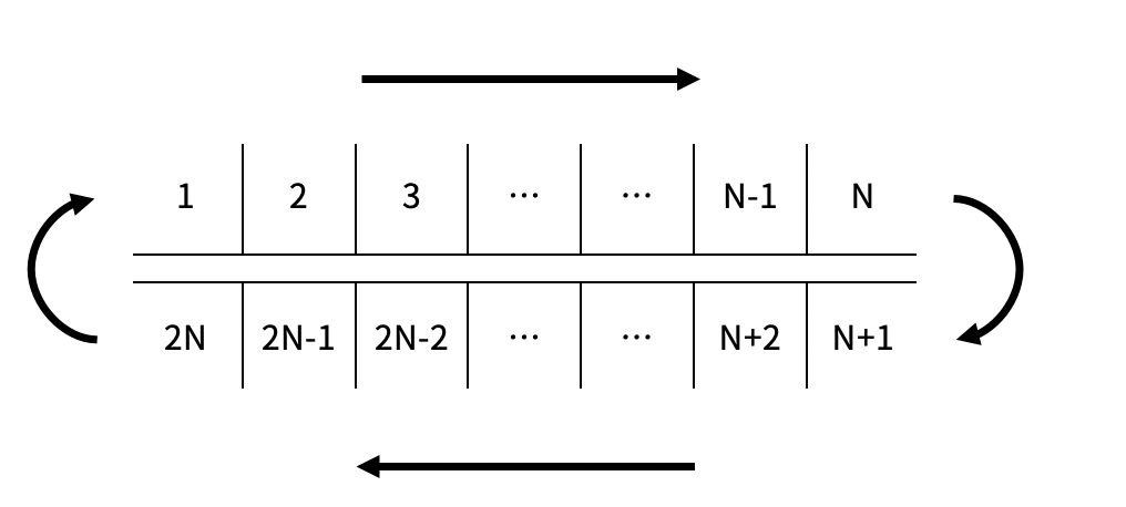 길이가 N인 컨베이어 벨트가 있고, 길이가 2N인 벨트가 이 컨베이어 벨트를 위아래로 감싸며 돌고 있다. 벨트는 길이 1 간격으로 2N개의 칸으로 나뉘어져 있으며, 각 칸에는 아래 그림과 같이 1부터 2N까지의 번호가 매겨져 있다.