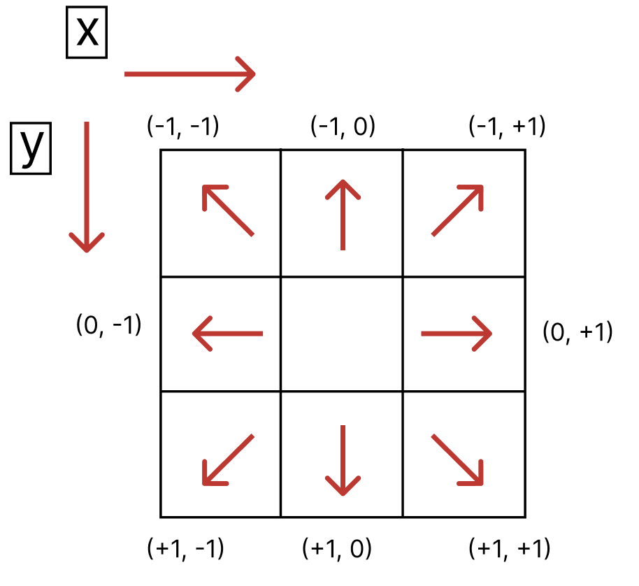 dy = [-1, -1, 0, 1, 1, 1, 0, -1]