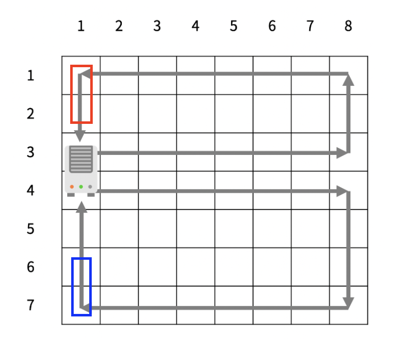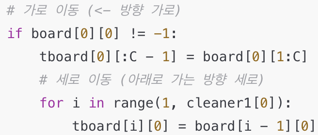 만약 위의 그림에서 공기 청정기가 빨간색 또는 파란색 부분에 있게 되면 오른쪽에서 왼쪽으로 가는 <- 방향의 마지막 칸에는 공기 청정기가 있기 때문에 그 경우를 고려해주기 위한 코드이다 !! 또한, 만약 그렇게 되면 1열의 아래로 가거나 위로 가는 회전을 안해도 되는 경우가 생기는 것이다 ! (그럴경우 시계방향 또는 반시계방향 하나만 그러겠죠 ??)