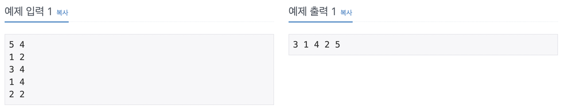 둘째 줄부터 M개의 줄에 걸쳐서 공을 교환할 방법이 주어진다. 각 방법은 두 정수 i j로 이루어져 있으며, i번 바구니와 j번 바구니에 들어있는 공을 교환한다는 뜻이다. (1 ≤ i ≤ j ≤ N)