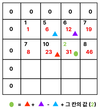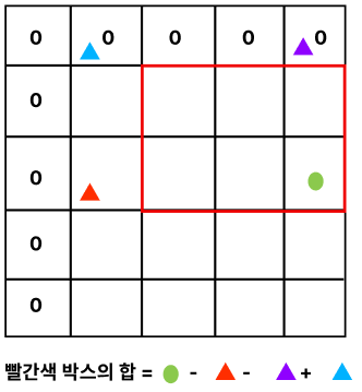 위에서 누적합을 이용하여 빨간색 박스의 합을 구하는 규칙은 위의 이미지와 같습니다. 빨간색 박스가 (1, 1) ~ (1, 4)와같이 가장 끝에 붙은 박스이더라도, 가장 왼쪽과 위의 값은 0으로 채워져 있기 때문에 동일한 규칙을 적용하면 됩니다.