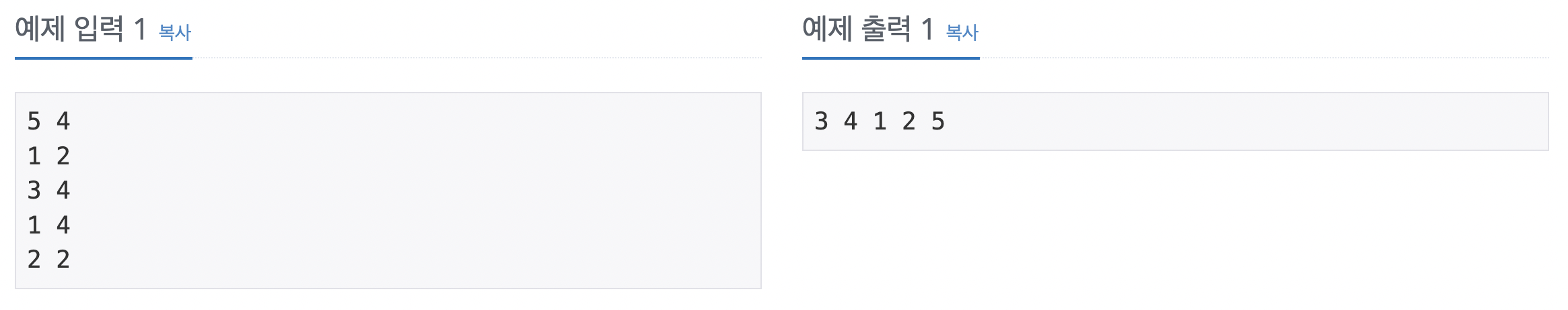 둘째 줄부터 M개의 줄에는 바구니의 순서를 역순으로 만드는 방법이 주어진다. 방법은 i j로 나타내고, 왼쪽으로부터 i번째 바구니부터 j번째 바구니의 순서를 역순으로 만든다는 뜻이다. (1 ≤ i ≤ j ≤ N)