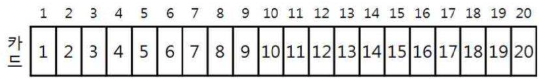 1부터 20까지 숫자가 하나씩 쓰인 20장의 카드가 아래 그림과 같이 오름차순으로 한 줄로 놓 여있다. 각 카드의 위치는 카드 위에 적힌 숫자와 같이 1부터 20까지로 나타낸다.