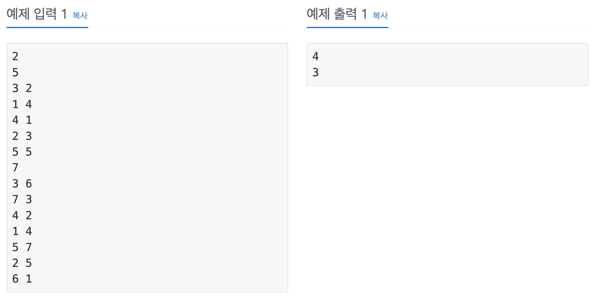 첫째 줄에는 테스트 케이스의 개수 T(1 ≤ T ≤ 20)가 주어진다. 각 테스트 케이스의 첫째 줄에 지원자의 숫자 N(1 ≤ N ≤ 100,000)이 주어진다. 둘째 줄부터 N개 줄에는 각각의 지원자의 서류심사 성적, 면접 성적의 순위가 공백을 사이에 두고 한 줄에 주어진다. 두 성적 순위는 모두 1위부터 N위까지 동석차 없이 결정된다고 가정한다.
