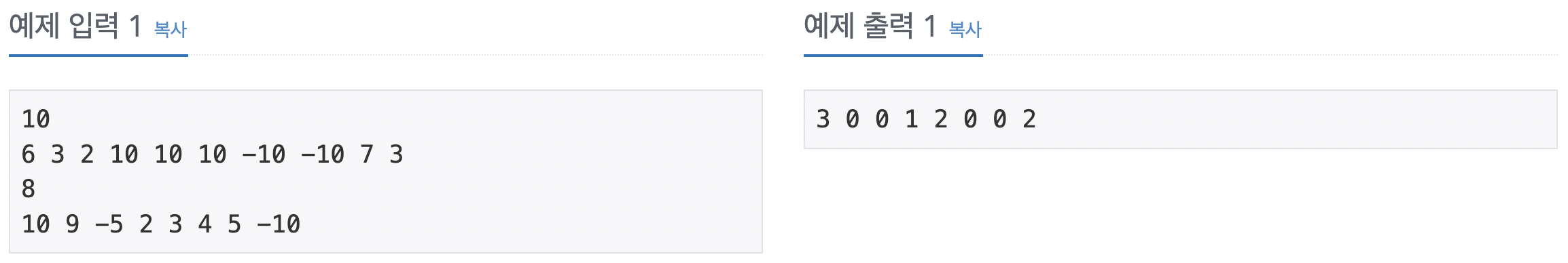 숫자 카드는 정수 하나가 적혀져 있는 카드이다. 상근이는 숫자 카드 N개를 가지고 있다. 정수 M개가 주어졌을 때, 이 수가 적혀있는 숫자 카드를 상근이가 몇 개 가지고 있는지 구하는 프로그램을 작성하시오.