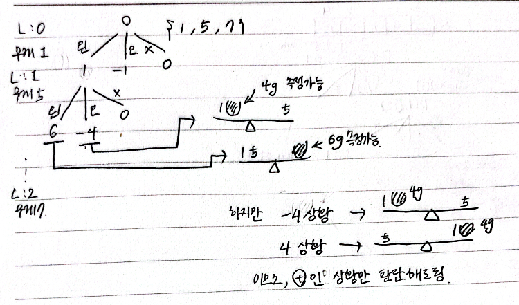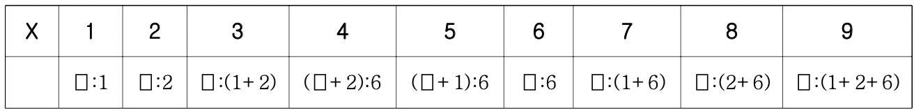 주어진 모든 추 무게의 합을 S라 하자. 예를 들어, 추가 3개이고, 각 추의 무게가 {1, 2, 6}이 면, S=9이고, 양팔저울을 한 번만 이용하여 1부터 S사이에 대응되는 모든 무게의 물을 다음과 같이 그릇에 담을 수 있다. X는 그릇에 담는 물의 무게이고, ⎕은 그릇을 나타낸다.